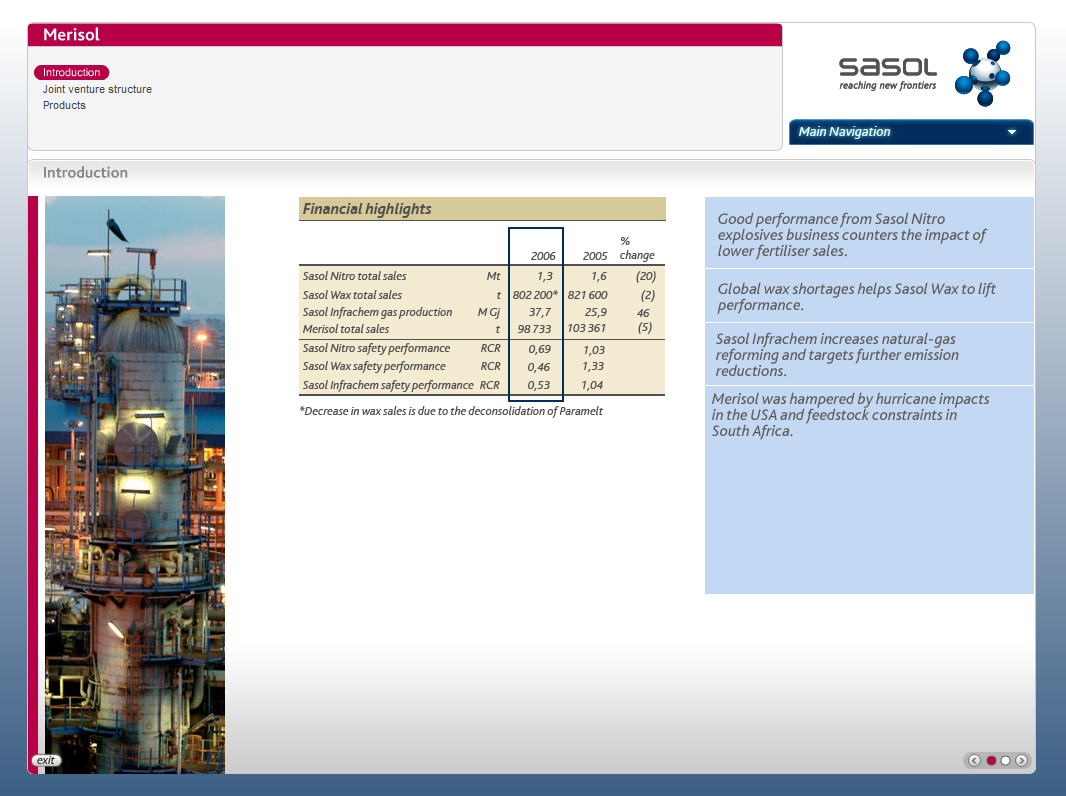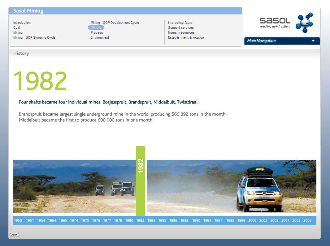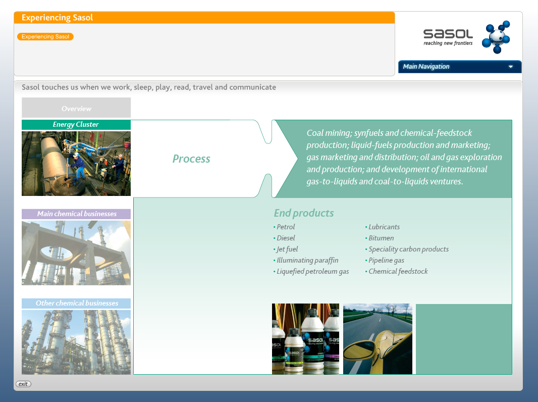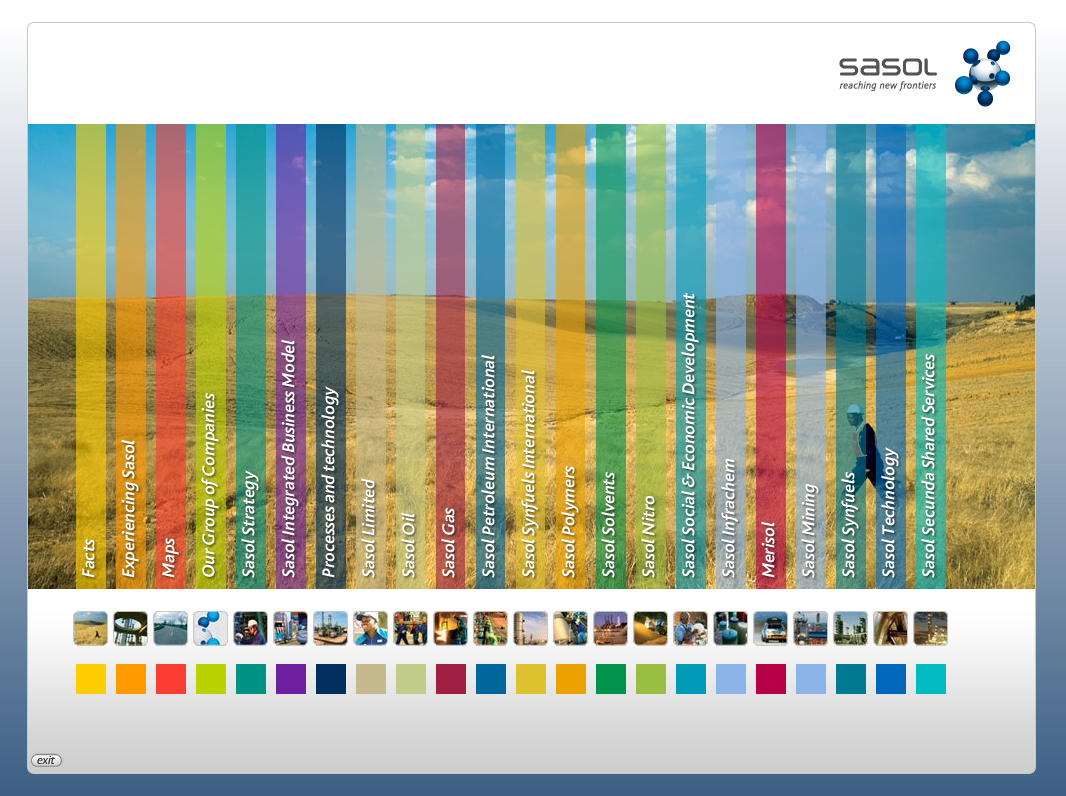 Sasol required an interactive CD-Rom that could be used as a visual sales/information tool which highlighted the various departments, products and procedures of the entire Sasol group. The final product featured over 3000 pages of information including over 100 static and interative info-graphics. I was involved with the art direction, UI/UX design, front-end design and development.